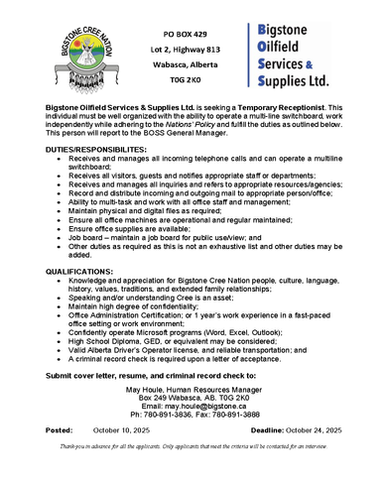 Apply to work with Bigstone Cree Nation or one of our departments. Jobs may be in various locations: Wabasca, Chipewyan Lake, Calling Lake or Edmonton.
